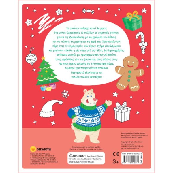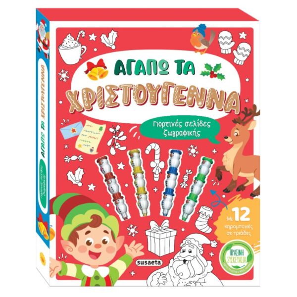 Σε αυτό το υπέροχο κουτί θα βρεις ένα μπλοκ ζωγραφικής με 32 γιορτινές εικόνες, για να τις ζωντανέψεις με τα χρώματα που θέλεις και να νιώσεις τη μαγεία και τη χαρά των Χριστουγέννων! Χάρη στις 12 κηρομπογιές, που έχουν σχήμα χιονάνθρωπου και μπαίνουν εύκολα η μία πάνω από την άλλη, θα δημιουργήσεις απίθανες σκηνές με πρωταγωνιστές τον Αϊ-Βασίλη, τους ταράνδους του, τα ξωτικά και τους φίλους τους. Θα τους βρεις ανάμεσα σε εντυπωσιακά δώρα, λαμπερά χριστουγεννιάτικα στολίδια, λαχταριστά γλυκίσματα και πολλές πολλές εκπλήξεις!
