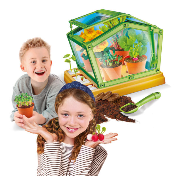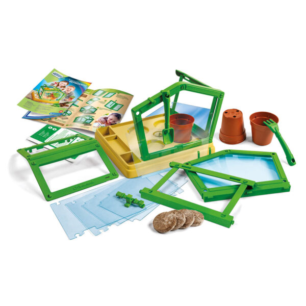 Ένα πρωτότυπο διαφανές θερμοκήπιο, χώμα, δοχεία για καλλιέργεια και εικονογραφημένο εγχειρίδιο για τη μελέτη γύρω από την καλλιέργεια και την ανάπτυξη των φυτών. Ένα πλήρες σετ για την κατασκευή θερμοκηπίου με τοιχώματα και σκεπή. Συνδυασμός γνώσης και διασκέδασης. Εσωτερική καλλιέργεια + εξωτερικές θήκες για καλλιέργεια βαμβακιού. Δυνατότητα αποθήκευσης των εργαλείων εργασίας κρεμασμένα στους γάντζους της κατασκευής.