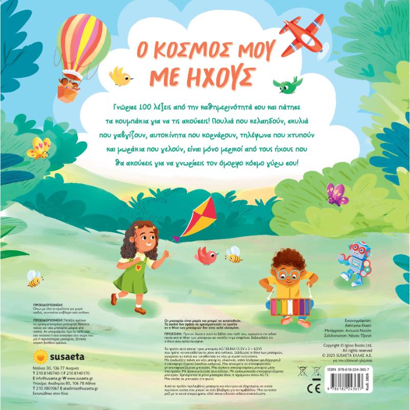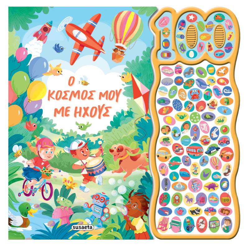 Γνώρισε 100 λέξεις από την καθημερινότητά σου και πάτησε τα κουμπάκια για να τις ακούσεις! Πουλιά που κελαηδούν, σκυλιά που γαβγίζουν, αυτοκίνητα που κορνάρουν, τηλέφωνα που χτυπούν και μωράκια που γελούν, είναι μόνο μερικοί από τους ήχους που θα ακούσεις για να γνωρίσεις τον όμορφο κόσμο γύρω σου! Διαστάσεις: 21,4 x 28 εκ.