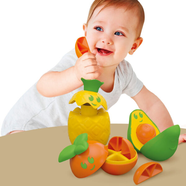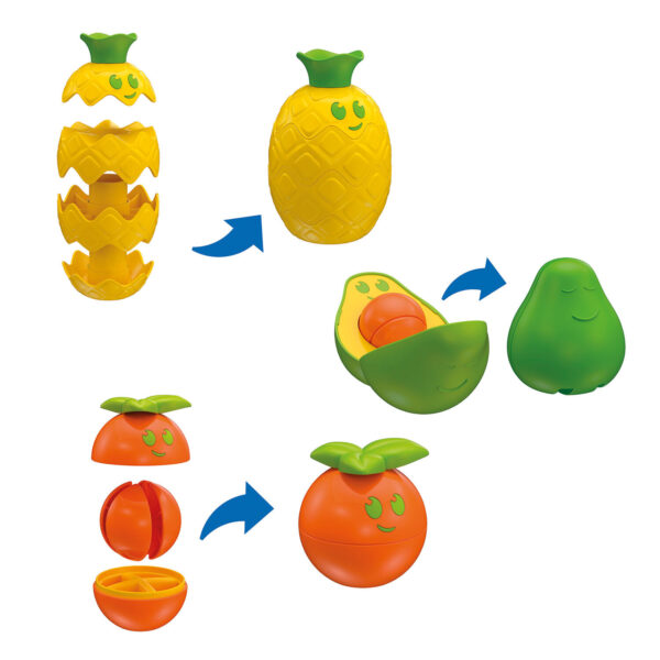 Το αβοκάντο ανοίγει και κρύβει μια μπάλα που πρέπει να αφαιρεθεί και να ξαναμπεί. Ο ανανάς αποτελείται από στοιβαζόμενα στοιχεία, το πορτοκάλι ανοίγει και κρύβει 4 φέτες που πρέπει να αφαιρεθούν και να μπουν ξανά μέσα. Κάθε φρούτο διεγείρει διαφορετικές χειρωνακτικές ασκήσεις και διάφορες αισθητηριακές εμπειρίες χάρη στις υφές του.