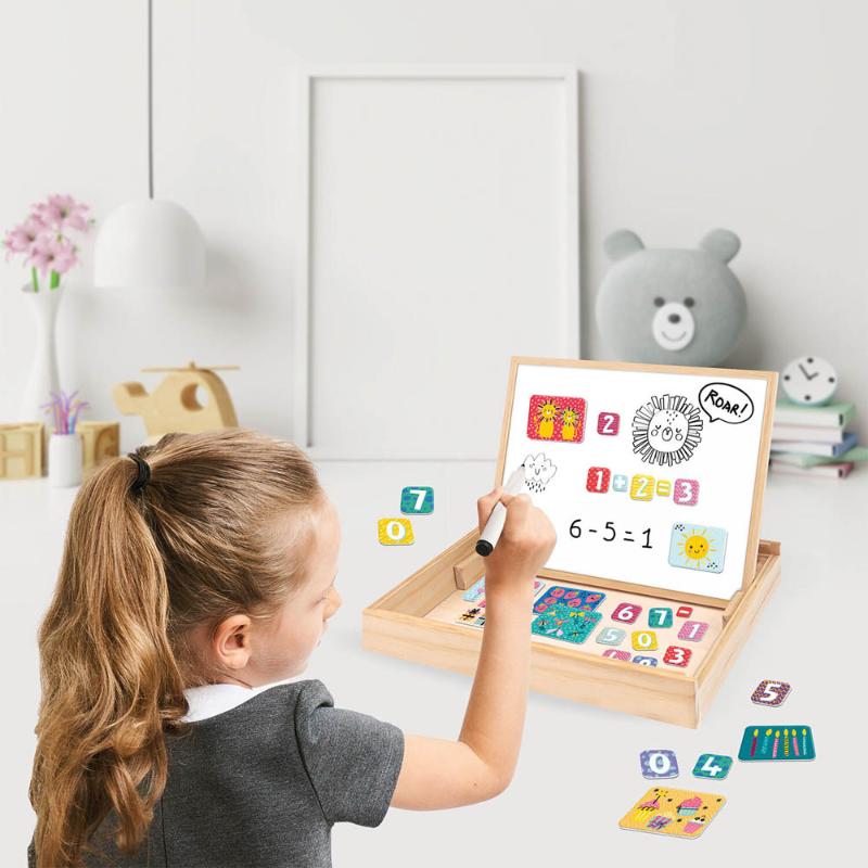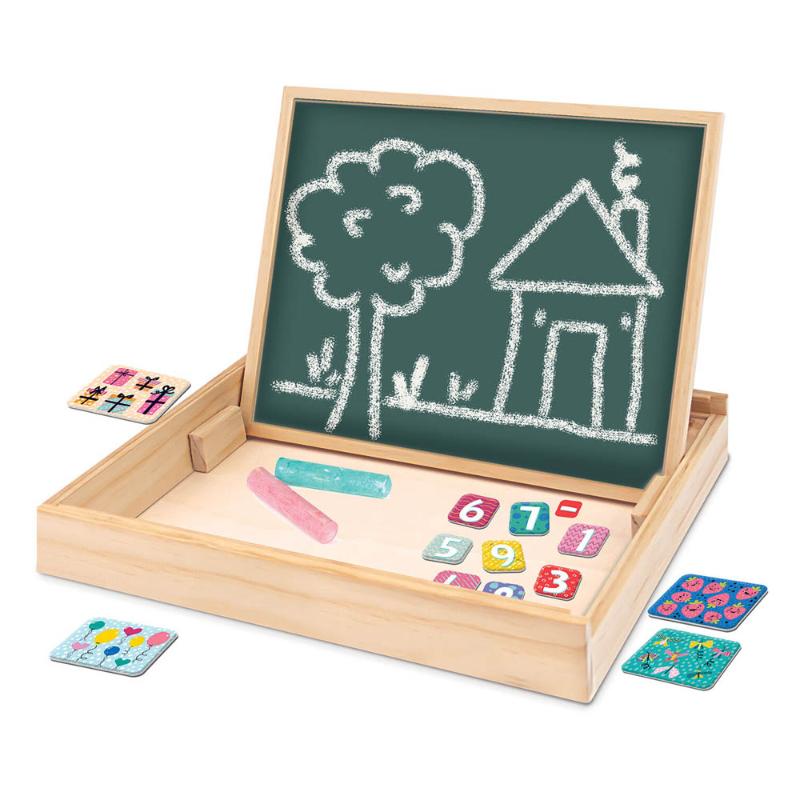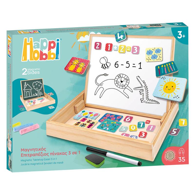 AS Company HappiHobbi Magnet Ξύλινος Μαγνητικός Επιτραπέζιος Πίνακας 2 Όψεων Με 35 Εκπαιδευτικούς Μαγνήτες (1029-64086). Ο μαγνητικός επιτραπέζιος πίνακας HappiHobbi είναι ένα εύχρηστο ξύλινο κουτί που μεταμορφώνεται σε μαγνητικό πίνακα ζωγραφικής δύο όψεων. Αποτελεί ιδανική απασχόληση για το παιδί εντός σπιτιού αλλά κι εκτός αυτού, χάρη στο πρακτικό μέγεθός του. Το παιδί δημιουργεί αλλά και εκπαιδεύεται στην αναγνώριση αριθμών μέσω των μαγνητών που περιλαμβάνονται. Χαρακτηριστικά: Δύο μαγνητικές όψεις: Ενδείκνυνται για ελεύθερα σχέδια στον πίνακα μαρκαδόρου, για χρήση κιμωλίας στο μαυροπίνακα, αλλά και για μαγνητικό παιχνίδι. Ξύλινη κατασκευή: Ο επιτραπέζιος πίνακας είναι κατασκευασμένος από ξύλο, καθιστώντας τον οικολογικό και ανθεκτικό στο χρόνο. Αποθήκευση: Δε χρειάζεται να ανησυχείτε μήπως χάσετε κάποιο από τα αξεσουάρ που διαθέτει ο επιτραπέζιος μαγνητικός πίνακας, καθώς ο ίδιος διαθέτει αποθηκευτικό χώρο για εύκολη και άνετη τακτοποίηση και αποθήκευση. Περιλαμβάνει: