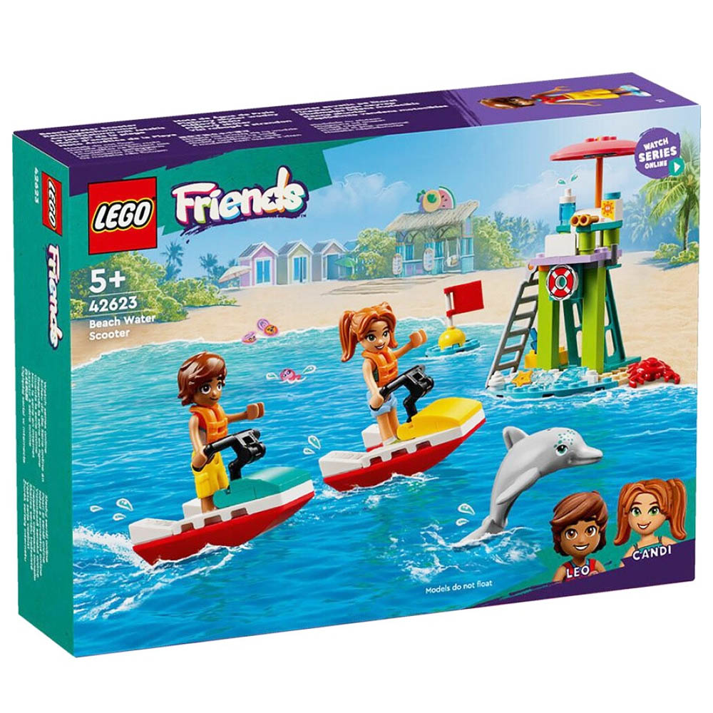 LEGO Friends Beach Water Scooter (42623). Ο Leo έχει καθήκοντα ναυαγοσώστη σήμερα. Ανεβαίνει στη σκάλα και με τα κιάλια παρακολουθεί τη θάλασσα. Είναι το ιδανικό σημείο για να εντοπίσει και δελφίνια. Αργότερα συναντά τη φίλη του Candi και κάνουν αγώνες με τα θαλάσσια σκούτερ. Πρόσεχε το πονηρό καβούρι που κάνει επιδρομή στο ψυγειάκι για γρανίτες. Η συσκευασία περιέχει 84 κομμάτια.